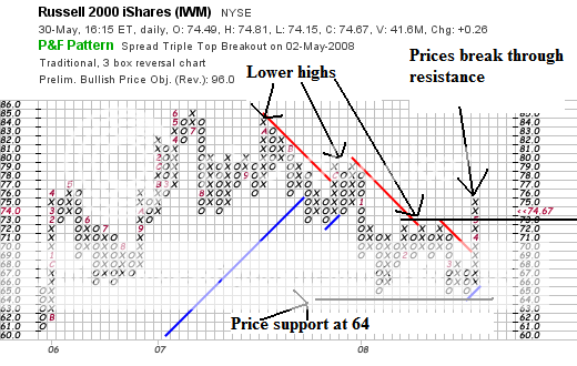 -- On the P&F charts all the charts have printed a series of lower highs. That's bearish. However, the IWMs breakout throws a bit of a wrench into that theory.